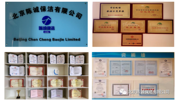 在这十年的历程中北京陈诚保洁有限公司荣获《优秀供应商》《北京市市级行政事业单位定点政府采购单位》《公共卫生辅助服务机构资质证书》《绿色建筑健康环境管理服务机构资质证书》《垃圾分类服务机构资质证书》《清洁行业协会及公益证书》《有害生物防制服务企业资质证书》等。